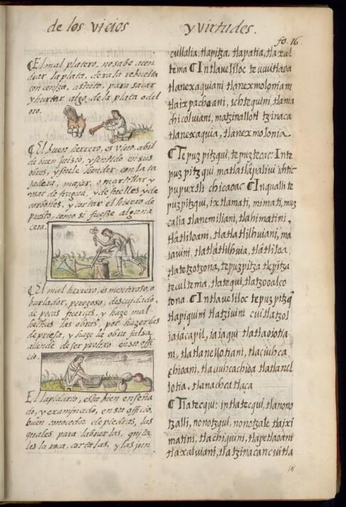 Visual Content and Iconography | tetl tletl, tlenenepilli zacatl (grass) icpalli tlalia pitza, tlapitza teocuitlatl, coztic teocuitlatl oquichtli toltecatl teocuitlapitzqui nelpiloni tecolli - - - | stone fire, flame grass seat to sit to blow, to play a wind instrument gold man craftsman goldcaster belt charcoal, clay and coal mold (metallurgy) breeches shirt tunic | piedra fuego, llama zacate asiento sentar soplar, tocar un instrumento de viento oro hombre artesana/o fundidor/a de oro cinturón carbón, molde de arcilla y carbón (metalurgia) calzas camisa ropilla | tetl tlitl, lemeni zacatl cuachichi mocehuihtoc mopitzticah ce tlamantli tlen tlapitzanih teocuitlatl tlacatl tlamachihchihualli tecuitlaatilihquetl cintoron tlicolli, moldez tlamantli pantalon camizah cotomitl cototztzin tlen tlacameh | tetl (nci)stone (eng)piedra (spa)tetl (nhe) | tletl, tlenenepilli (nci)fire, flame (eng)fuego, llama (spa)tlitl, lemeni (nhe) | zacatl (grass) (nci)grass (eng)zacate (spa)zacatl (nhe) | icpalli (nci)seat (eng)asiento (spa)cuachichi (nhe) | tlalia (nci)to sit (eng)sentar (spa)mocehuihtoc (nhe) | pitza, tlapitza (nci)to blow, to play a wind instrument (eng)soplar, tocar un instrumento de viento (spa)mopitzticah ce tlamantli tlen tlapitzanih (nhe) | teocuitlatl, coztic teocuitlatl (nci)gold (eng)oro (spa)teocuitlatl (nhe) | oquichtli (nci)man (eng)hombre (spa)tlacatl (nhe) | toltecatl (nci)craftsman (eng)artesana/o (spa)tlamachihchihualli (nhe) | teocuitlapitzqui (nci)goldcaster (eng)fundidor/a de oro (spa)tecuitlaatilihquetl (nhe) | nelpiloni (nci)belt (eng)cinturón (spa)cintoron (nhe) | tecolli (nci)charcoal, clay and coal mold (metallurgy) (eng)carbón, molde de arcilla y carbón (metalurgia) (spa)tlicolli, moldez (nhe) | - (nci)breeches (eng)calzas (spa)tlamantli pantalon (nhe) | - (nci)shirt (eng)camisa (spa)camizah (nhe) | - (nci)tunic (eng)ropilla (spa)cotomitl cototztzin tlen tlacameh (nhe) |