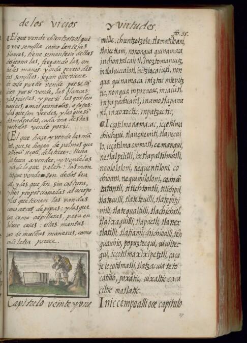 Visual Content and Iconography | ilhuicatl mecapalli mecatl tepetl zacatl (grass) cacaxtli ixcuamama tlamamalli oquichtli - pochtecatl tlanamacani iczotilmahnamacac tlanehnemitiani nemi, nehnemi iczotilmahtli - - iczotl | sky tumpline cord, rope hill grass carrying frame to carry with a tumpline burden man landscape merchant seller seller of palm leaf fiber capes traveler to walk palm leaf fiber cape breeches tunic spanish bayonet, yucca | cielo mecapal mecate, cuerda cerro zacate cargadero llevar con una correa en la frente carga hombre paisaje comerciante vendedor/a vendedor/a de mantas de fibra de palma viajero andar manta de fibra de palma calzas ropilla izote, palma | elhuicatl pretal mecatl tepetl zacatl chiquihuitl ica cuexcuayoctli mohuica ce tlamantli ica ce mehuatl zo cuayolli tlamamalli tlacatl tlayehyectzin (quen neci zo oncah pan ce canahya) tlanamacaquetl tlanamacaquetl mantahnamacaquetl tlachihualli ica apachtli paxalohquetl, nehnenquetl nemi mantah tlachihualli ica apachtli tlamantli pantalon cotomitl cototztzin tlen tlacameh iczo | ilhuicatl (nci)sky (eng)cielo (spa)elhuicatl (nhe) | mecapalli (nci)tumpline (eng)mecapal (spa)pretal (nhe) | mecatl (nci)cord, rope (eng)mecate, cuerda (spa)mecatl (nhe) | tepetl (nci)hill (eng)cerro (spa)tepetl (nhe) | zacatl (grass) (nci)grass (eng)zacate (spa)zacatl (nhe) | cacaxtli (nci)carrying frame (eng)cargadero (spa)chiquihuitl ica cuexcuayoctli (nhe) | ixcuamama (nci)to carry with a tumpline (eng)llevar con una correa en la frente (spa)mohuica ce tlamantli ica ce mehuatl zo cuayolli (nhe) | tlamamalli (nci)burden (eng)carga (spa)tlamamalli (nhe) | oquichtli (nci)man (eng)hombre (spa)tlacatl (nhe) | - (nci)landscape (eng)paisaje (spa)tlayehyectzin (quen neci zo oncah pan ce canahya) (nhe) | pochtecatl (nci)merchant (eng)comerciante (spa)tlanamacaquetl (nhe) | tlanamacani (nci)seller (eng)vendedor/a (spa)tlanamacaquetl (nhe) | iczotilmahnamacac (nci)seller of palm leaf fiber capes (eng)vendedor/a de mantas de fibra de palma (spa)mantahnamacaquetl tlachihualli ica apachtli (nhe) | tlanehnemitiani (nci)traveler (eng)viajero (spa)paxalohquetl, nehnenquetl (nhe) | nemi, nehnemi (nci)to walk (eng)andar (spa)nemi (nhe) | iczotilmahtli (nci)palm leaf fiber cape (eng)manta de fibra de palma (spa)mantah tlachihualli ica apachtli (nhe) | - (nci)breeches (eng)calzas (spa)tlamantli pantalon (nhe) | - (nci)tunic (eng)ropilla (spa)cotomitl cototztzin tlen tlacameh (nhe) | iczotl (nci)spanish bayonet, yucca (eng)izote, palma (spa)iczo (nhe) |
