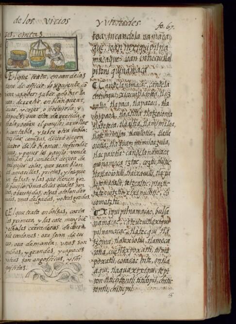 Visual Content and Iconography | caxitl, xicalli cuahuitl cuauhtlatilli necuacehualhuiloni tetl tletl, tlenenepilli zacatl (grass) icpalli tlalia petlatl oquichtli candelachiuhqui tlanamacani xicohcuitlanamacac, candelanamacac xicohcuitlaocotl xicohcuitlatl - | bowl, xicalli, cup wood (material) firewood hat stone fire, flame grass seat to sit reed mat man candle maker seller candle seller candle bees-wax tunic | cajete, plato, jícara madera (materia) leña sombrero piedra fuego, llama zacate asiento sentar petate hombre él/la que hace candelas vendedor/a vendedor/a de candelas candela cera de abeja ropilla | chachapalli, xicalli huapalli cuahuehhuelolli tzonecahuilli tetl tlitl, lemeni zacatl cuachichi mocehuihtoc petlatl tlacatl belahchiuhquetl, cantelahchiuhquetl tlanamacaquetl cantelahnamacaquetl cantelah cerah tlen neuctzin cotomitl cototztzin tlen tlacameh | caxitl, xicalli (nci)bowl, xicalli, cup (eng)cajete, plato, jícara (spa)chachapalli, xicalli (nhe) | cuahuitl (nci)wood (material) (eng)madera (materia) (spa)huapalli (nhe) | cuauhtlatilli (nci)firewood (eng)leña (spa)cuahuehhuelolli (nhe) | necuacehualhuiloni (nci)hat (eng)sombrero (spa)tzonecahuilli (nhe) | tetl (nci)stone (eng)piedra (spa)tetl (nhe) | tletl, tlenenepilli (nci)fire, flame (eng)fuego, llama (spa)tlitl, lemeni (nhe) | zacatl (grass) (nci)grass (eng)zacate (spa)zacatl (nhe) | icpalli (nci)seat (eng)asiento (spa)cuachichi (nhe) | tlalia (nci)to sit (eng)sentar (spa)mocehuihtoc (nhe) | petlatl (nci)reed mat (eng)petate (spa)petlatl (nhe) | oquichtli (nci)man (eng)hombre (spa)tlacatl (nhe) | candelachiuhqui (nci)candle maker (eng)él/la que hace candelas (spa)belahchiuhquetl, cantelahchiuhquetl (nhe) | tlanamacani (nci)seller (eng)vendedor/a (spa)tlanamacaquetl (nhe) | xicohcuitlanamacac, candelanamacac (nci)candle seller (eng)vendedor/a de candelas (spa)cantelahnamacaquetl (nhe) | xicohcuitlaocotl (nci)candle (eng)candela (spa)cantelah (nhe) | xicohcuitlatl (nci)bees-wax (eng)cera de abeja (spa)cerah tlen neuctzin (nhe) | - (nci)tunic (eng)ropilla (spa)cotomitl cototztzin tlen tlacameh (nhe) |