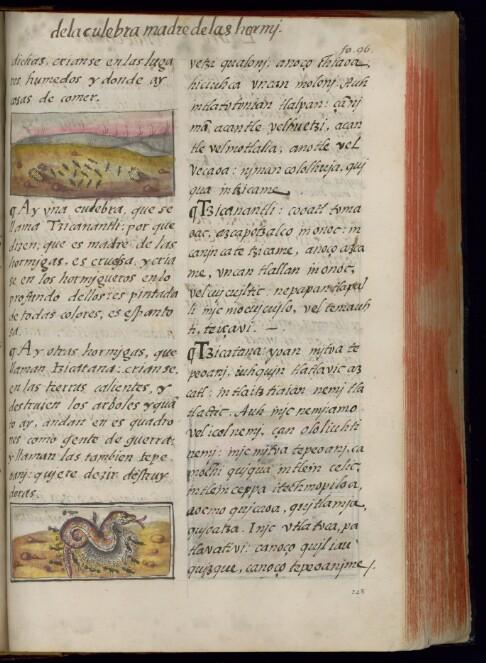 | Visual Content and Iconography | coatl tetl yolcatl, yolqui azcatl tzicanantli* - - - motetiani - mohuicomani - | serpent, snake stone animal, living being ant [type of colorful snake]* reptile, with hard skin squamates (order) insecta, insect (class) egg-layer, oviparous (animal) who lives on earth crawling, climbing animal "who eats seeds, vegetables, herbs and/or insects", herbivorous, insectivorous | serpiente piedra animal, ser vivo hormiga [tipo de serpiente colorida]* reptil, con piel dura escamosos (orden) insecto (clase) ovíparo (animal) terrestre animal que se arrastra "que come semillas, verduras, hierbas", herbívoro, insectívoro | coatl tetl tecuani, tlapiyalli ixcanelli, azcatl tzinacantli* tlen pantehtequeltic tlen quipiyah ipancacallo piltecuanitzitzin tlen tlacati pan tecciztli tlen nemi pan tlalli tlen mototoxoa tlen quicua cuayolotl, cuatlacquetl, xihuitl, piltecuanitzitzin | coatl (nci)serpent, snake (eng)serpiente (spa)coatl (nhe) | tetl (nci)stone (eng)piedra (spa)tetl (nhe) | yolcatl, yolqui (nci)animal, living being (eng)animal, ser vivo (spa)tecuani, tlapiyalli (nhe) | azcatl (nci)ant (eng)hormiga (spa)ixcanelli, azcatl (nhe) | tzicanantli* (nci)[type of colorful snake]* (eng)[tipo de serpiente colorida]* (spa)tzinacantli* (nhe) | - (nci)reptile, with hard skin (eng)reptil, con piel dura (spa)tlen pantehtequeltic (nhe) | - (nci)squamates (order) (eng)escamosos (orden) (spa)tlen quipiyah ipancacallo (nhe) | - (nci)insecta, insect (class) (eng)insecto (clase) (spa)piltecuanitzitzin (nhe) | motetiani (nci)egg-layer, oviparous (eng)ovíparo (spa)tlen tlacati pan tecciztli (nhe) | - (nci)(animal) who lives on earth (eng)(animal) terrestre (spa)tlen nemi pan tlalli (nhe) | mohuicomani (nci)crawling, climbing animal (eng)animal que se arrastra (spa)tlen mototoxoa (nhe) | - (nci)"who eats seeds, vegetables, herbs and/or insects", herbivorous, insectivorous (eng)"que come semillas, verduras, hierbas", herbívoro, insectívoro (spa)tlen quicua cuayolotl, cuatlacquetl, xihuitl, piltecuanitzitzin (nhe) |